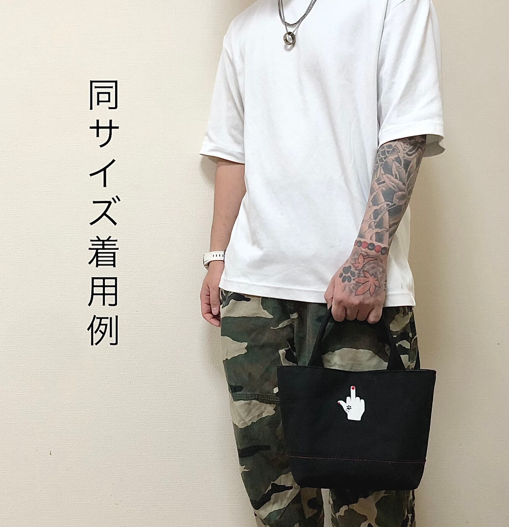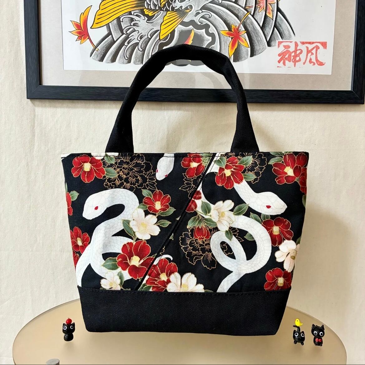 和柄ミニトートバッグ 花と蛇 ブラック Dカン付き ハンドメイド ストリート 帆布バッグ