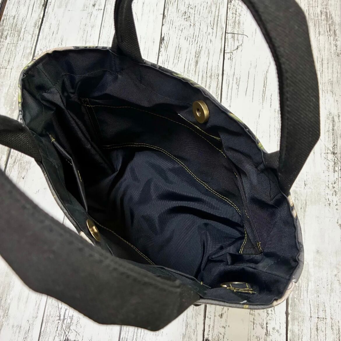 サイズ感等は画像をご確認ください。持ち手と底布に8号カラー帆布、内布に弱撥水ナイロン、外布と内布の間に11号帆布と硬めのバッグ用接着芯を使用した、軽く形崩れのしづらい丈夫な仕上がりのミニトートバッグです。遠出からちょっとしたお買い物やお散歩まで様々なシチュエーションでお使いいただけます。