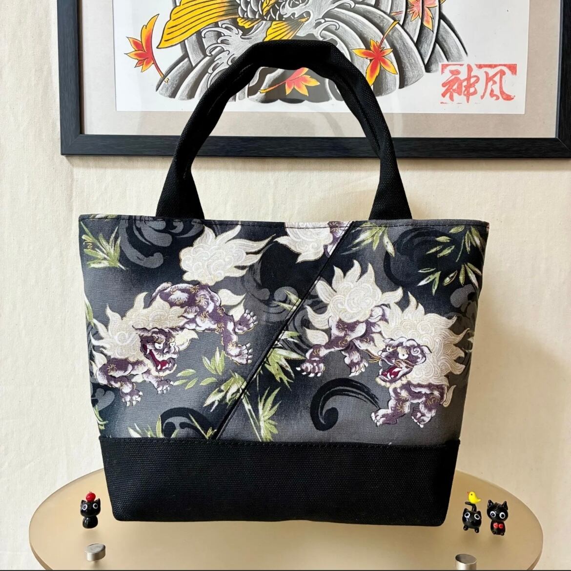 和柄ミニトートバッグ 狛犬 ブラック Dカン付き ハンドメイド ストリート 帆布バッグ