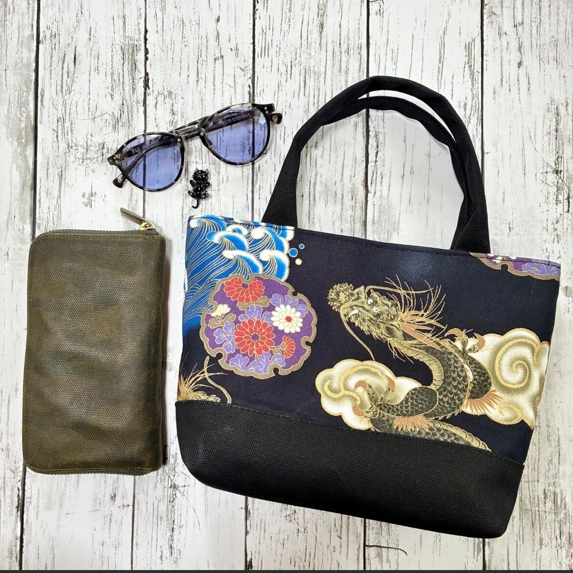 和柄ミニトートバッグ 龍柄 ブラック Dカン付き ハンドメイド ストリート 帆布バッグ