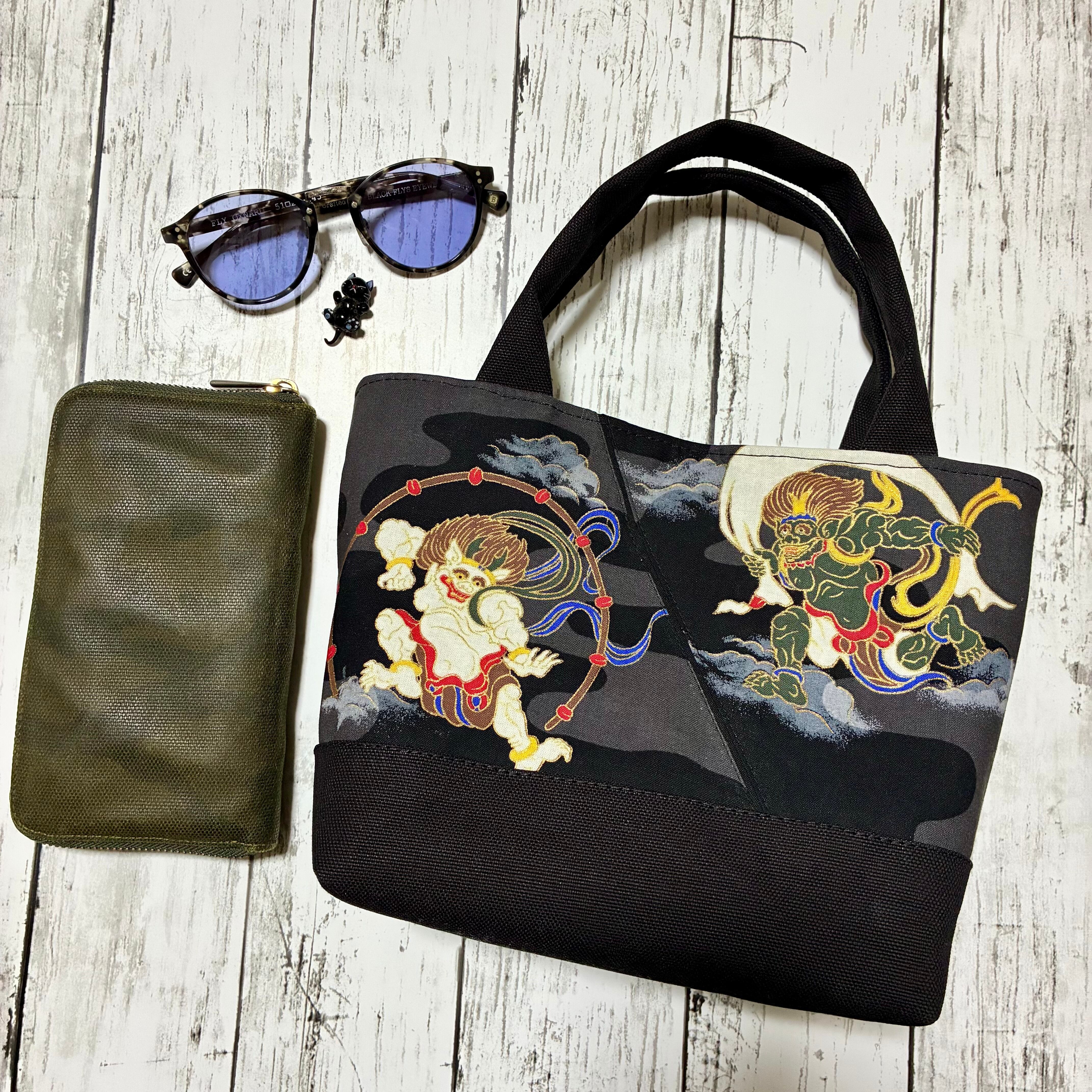 和柄ミニトートバッグ 風神雷神 ブラック Dカン付き ハンドメイド ストリート 帆布