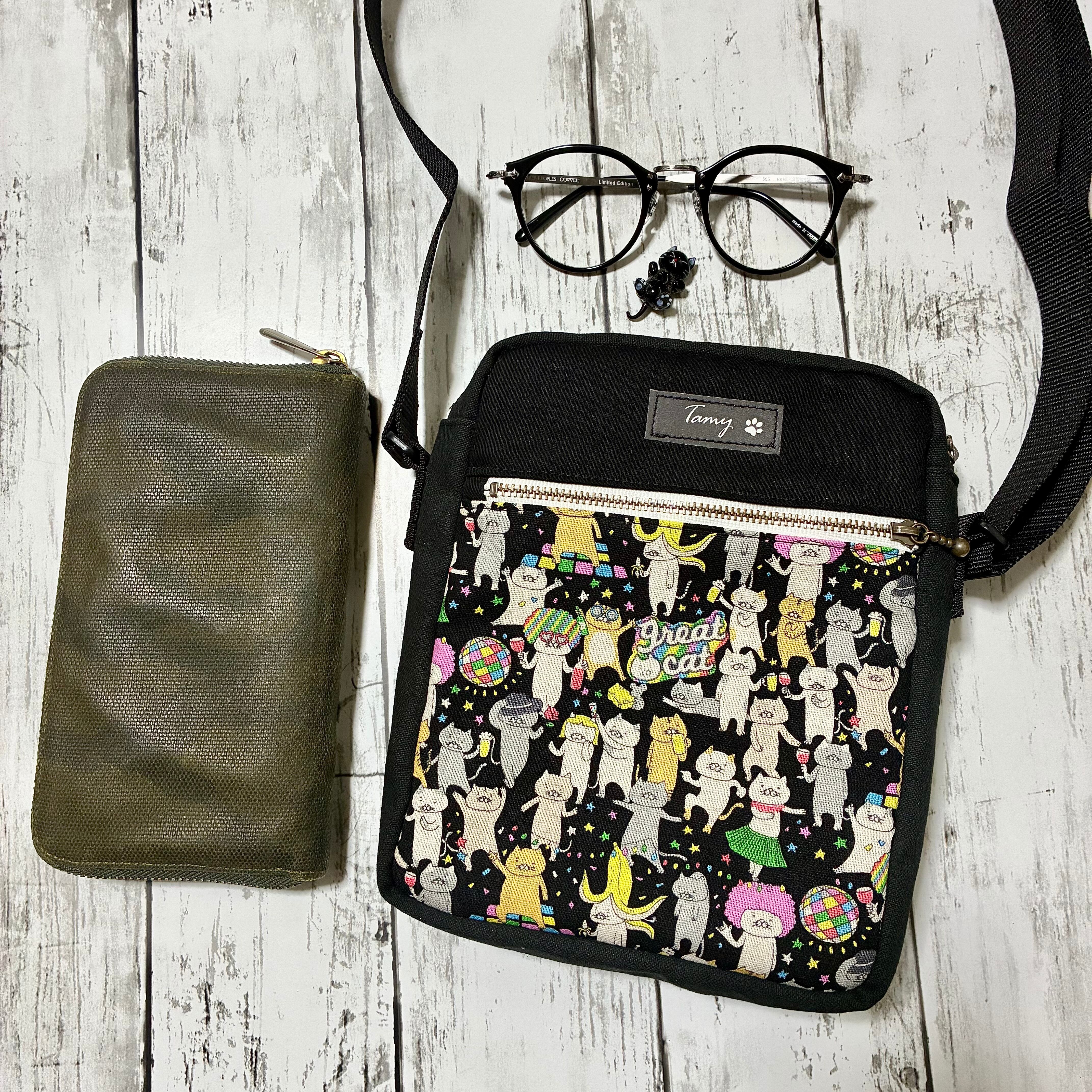 猫柄ミニショルダーバッグ パーリーにゃんこ ブラック ハンドメイド ストリート 帆布バッグ