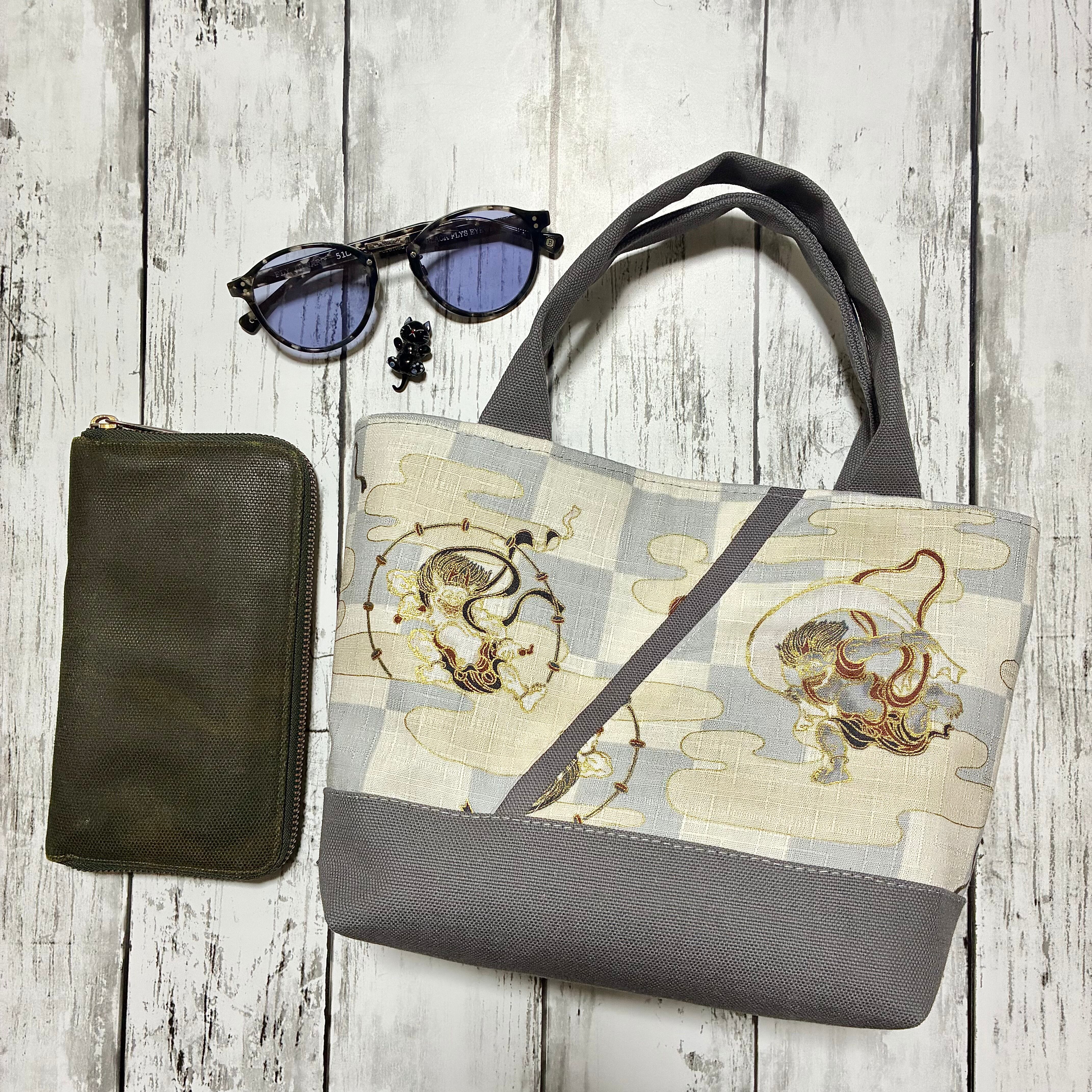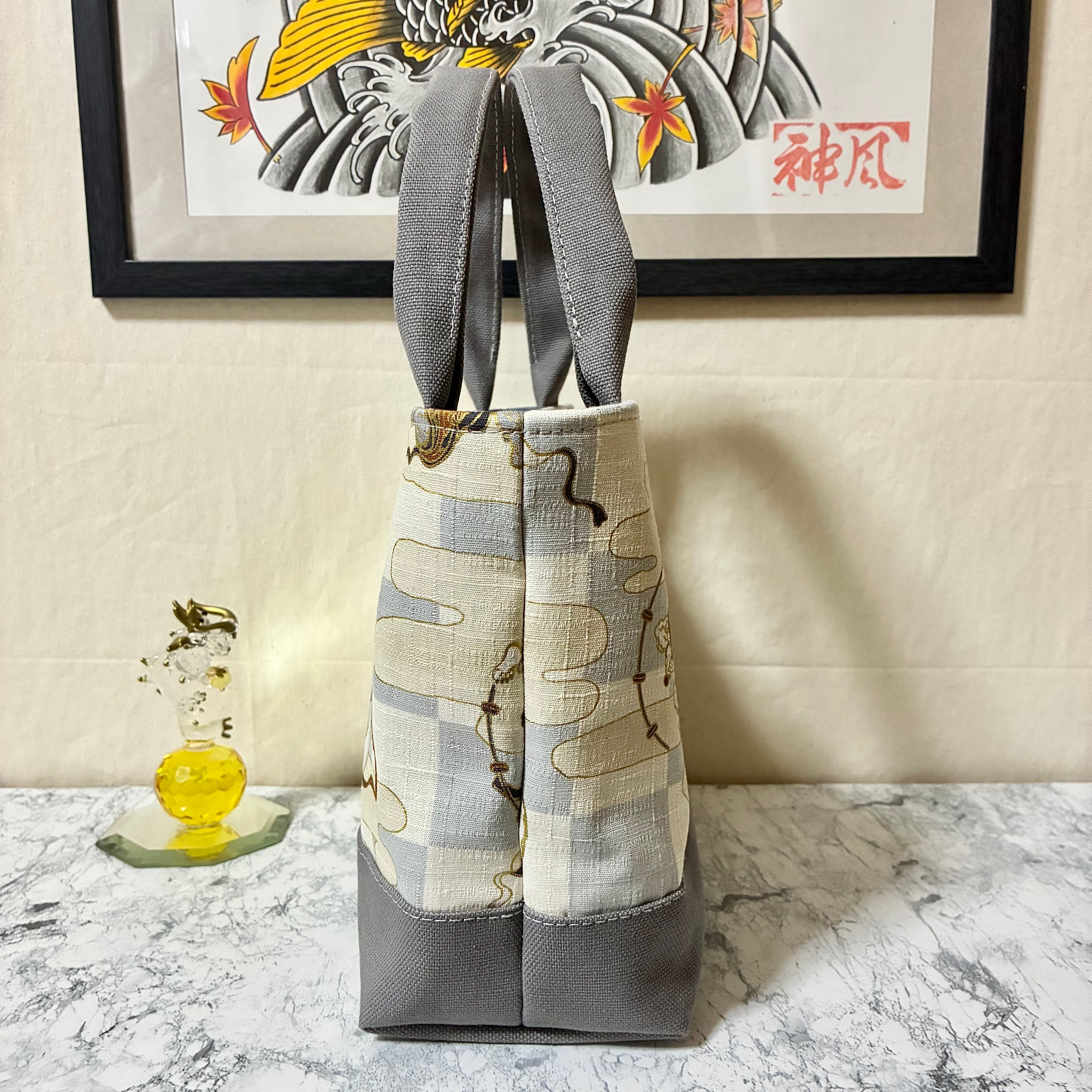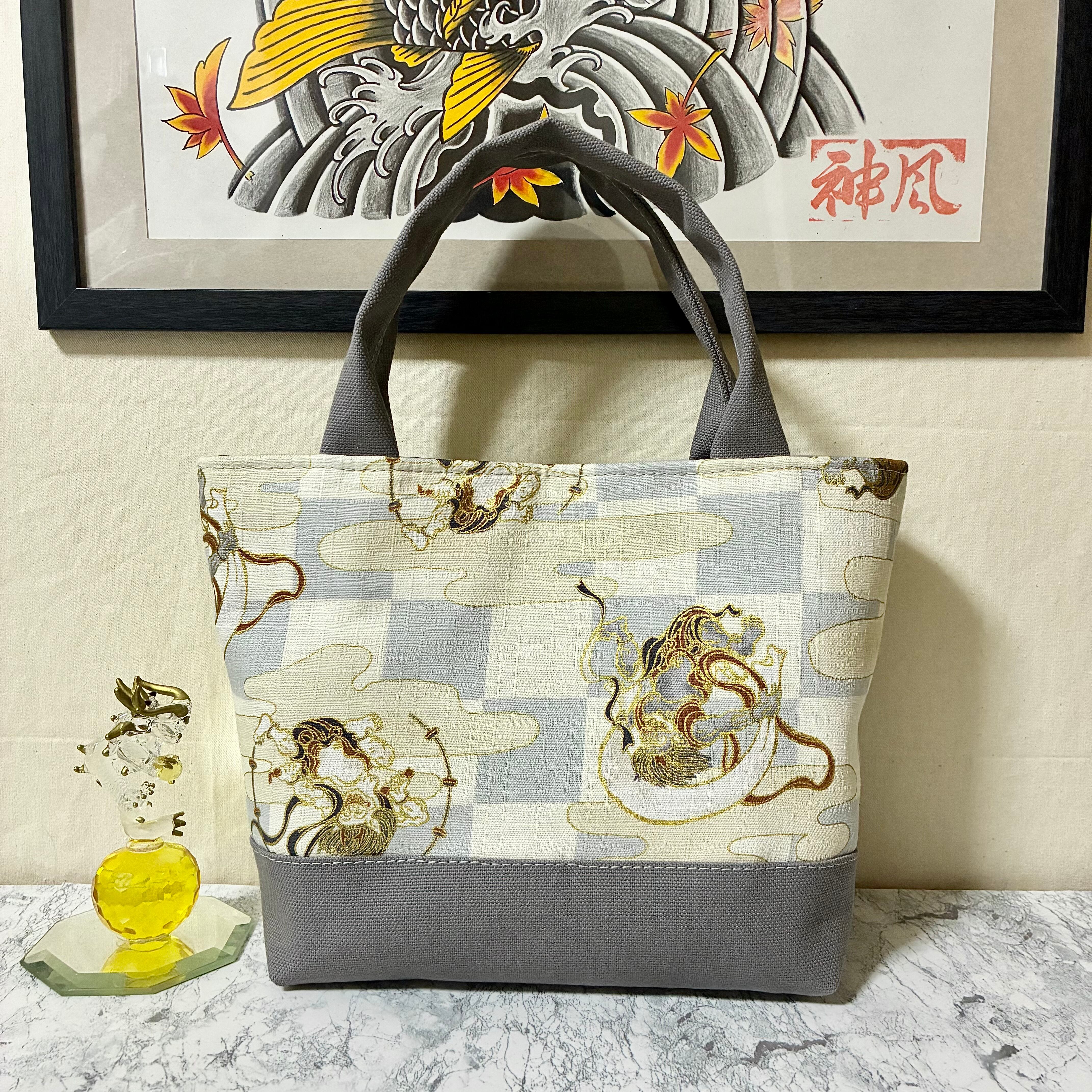 和柄ミニトートバッグ 風神雷神 ホワイト&グレー Dカン付き ハンドメイド ストリート 帆布バッグ