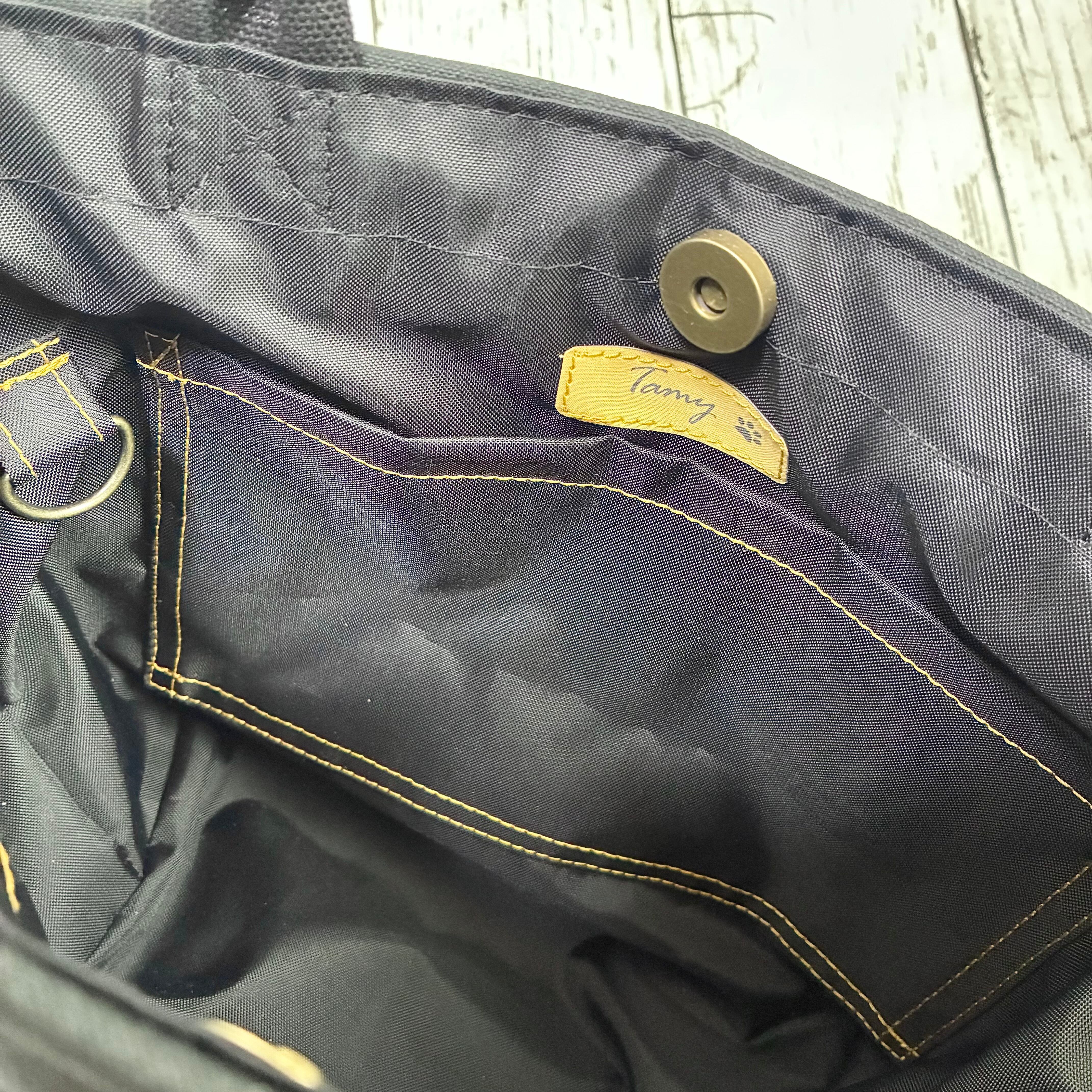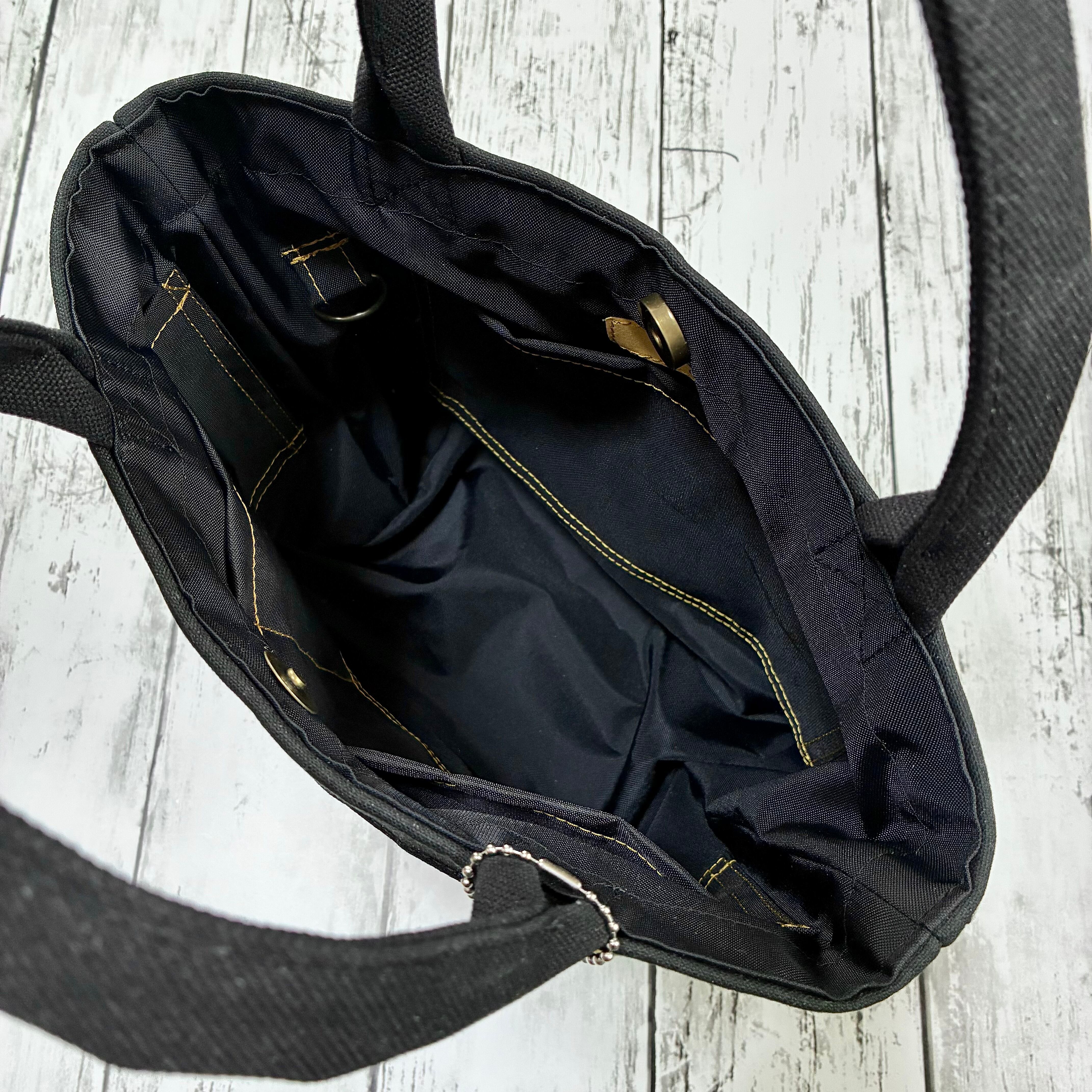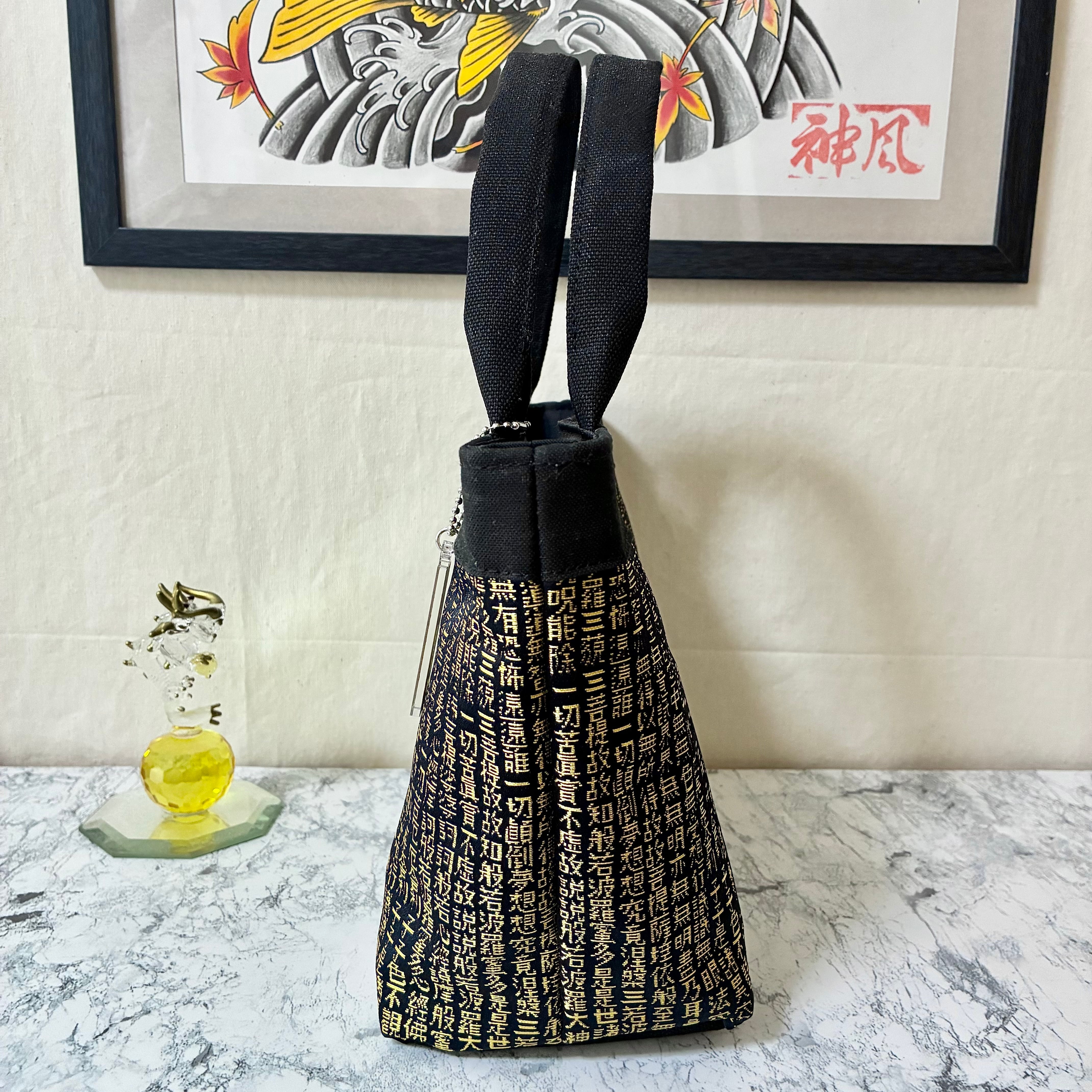 和柄ミニトートバッグ 般若心経(西陣織) 金文字ブラック Dカン付き ハンドメイド ストリート 帆布バッグ