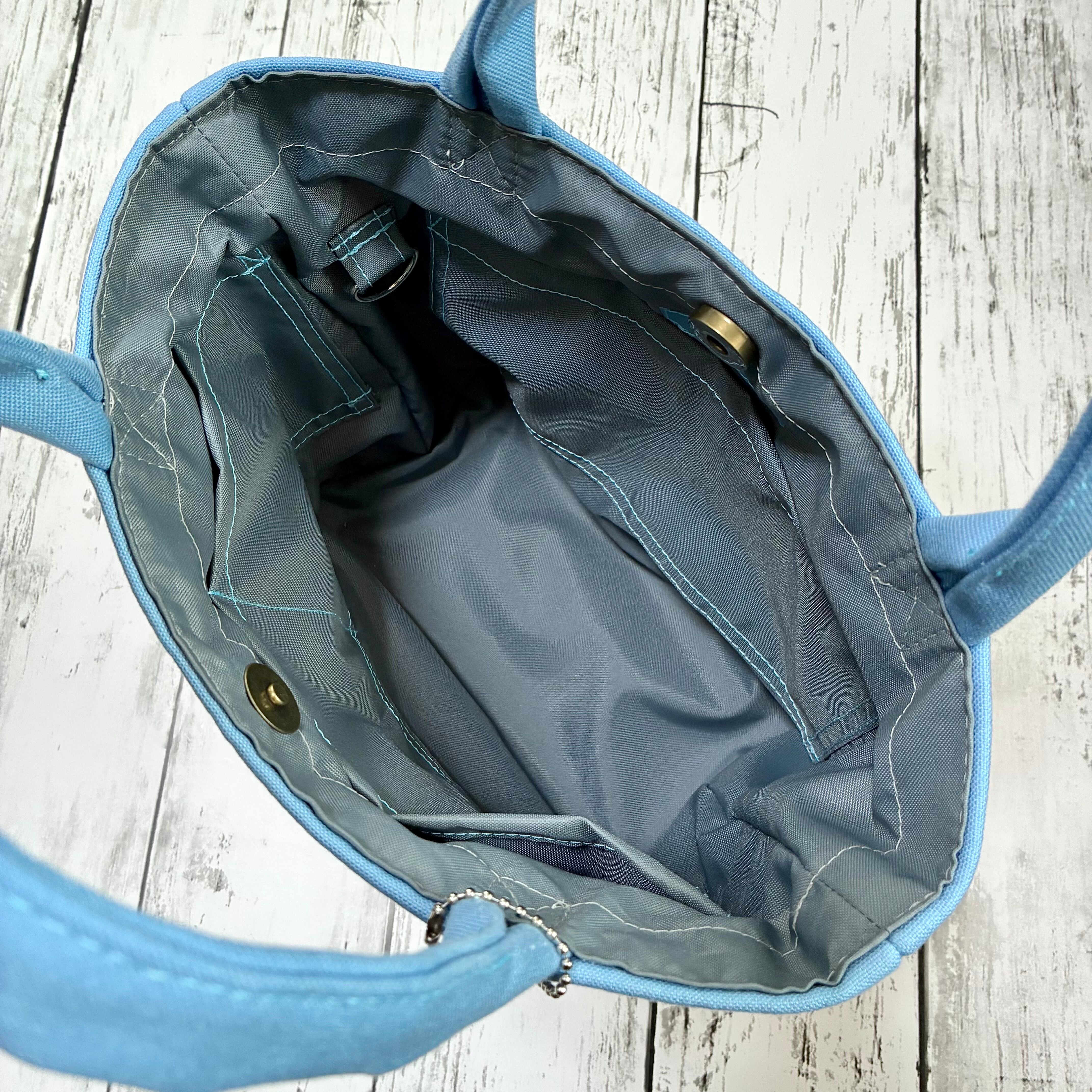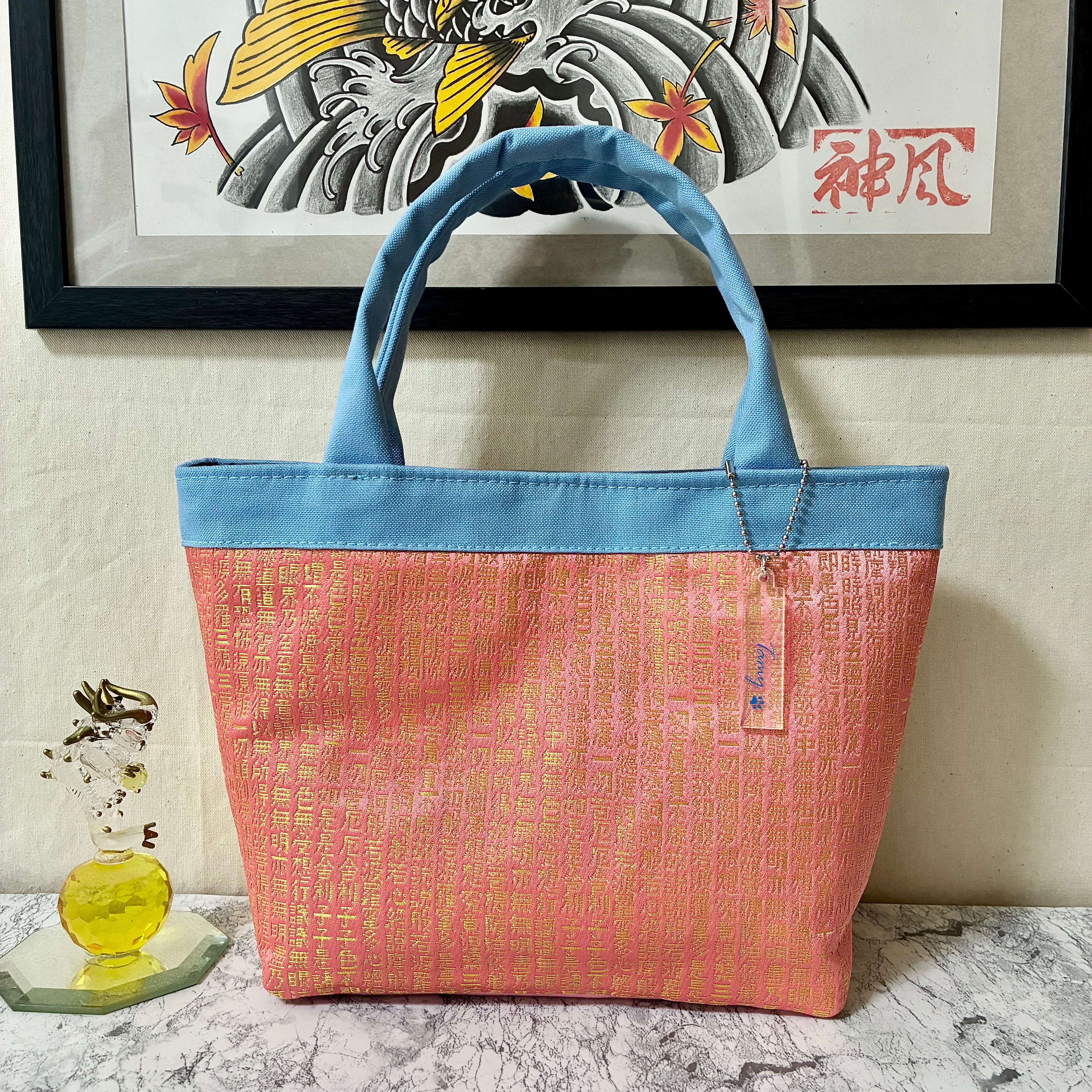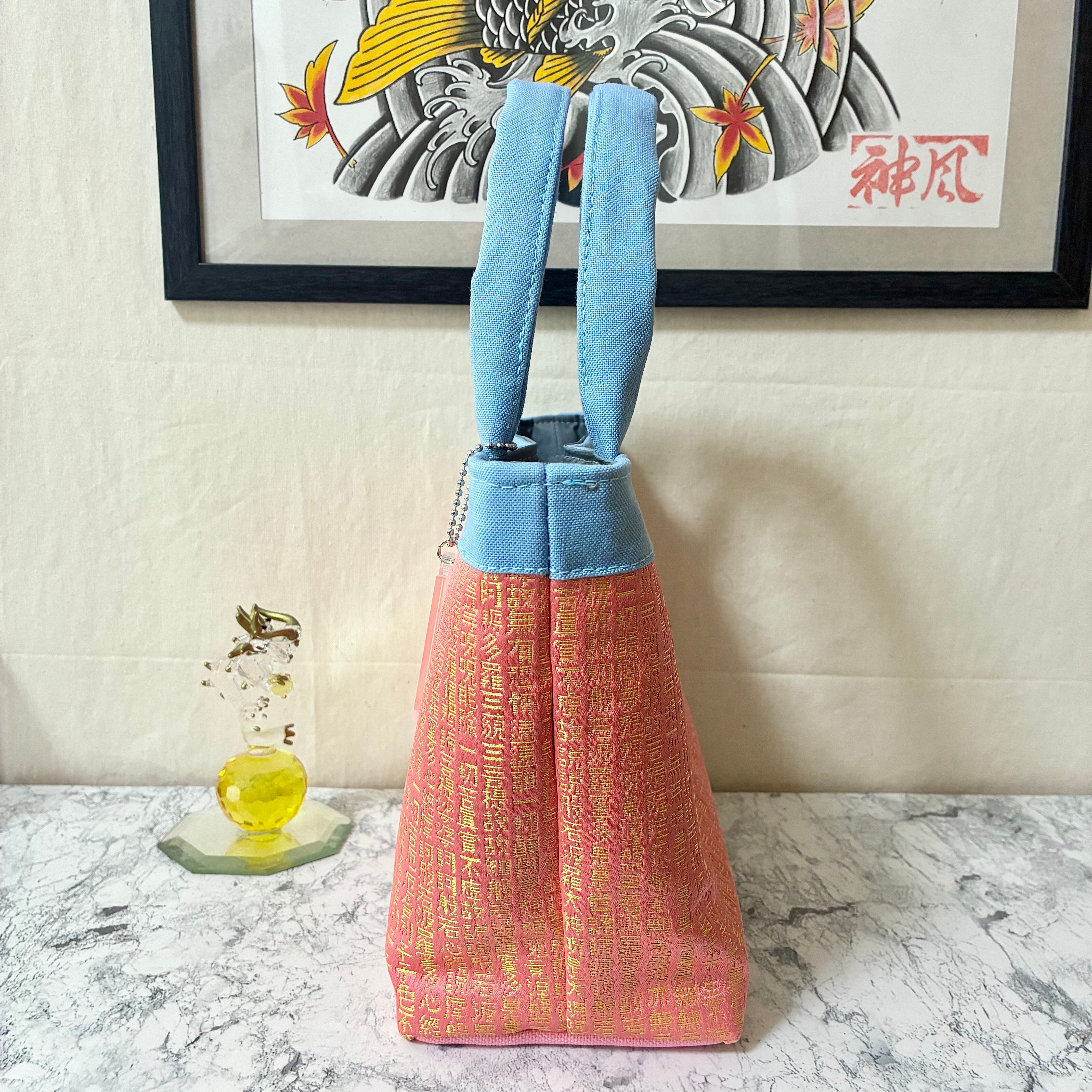 和柄ミニトートバッグ 般若心経(西陣織) ライトブルー&ピンク Dカン付き ハンドメイド ストリート 帆布バッグ