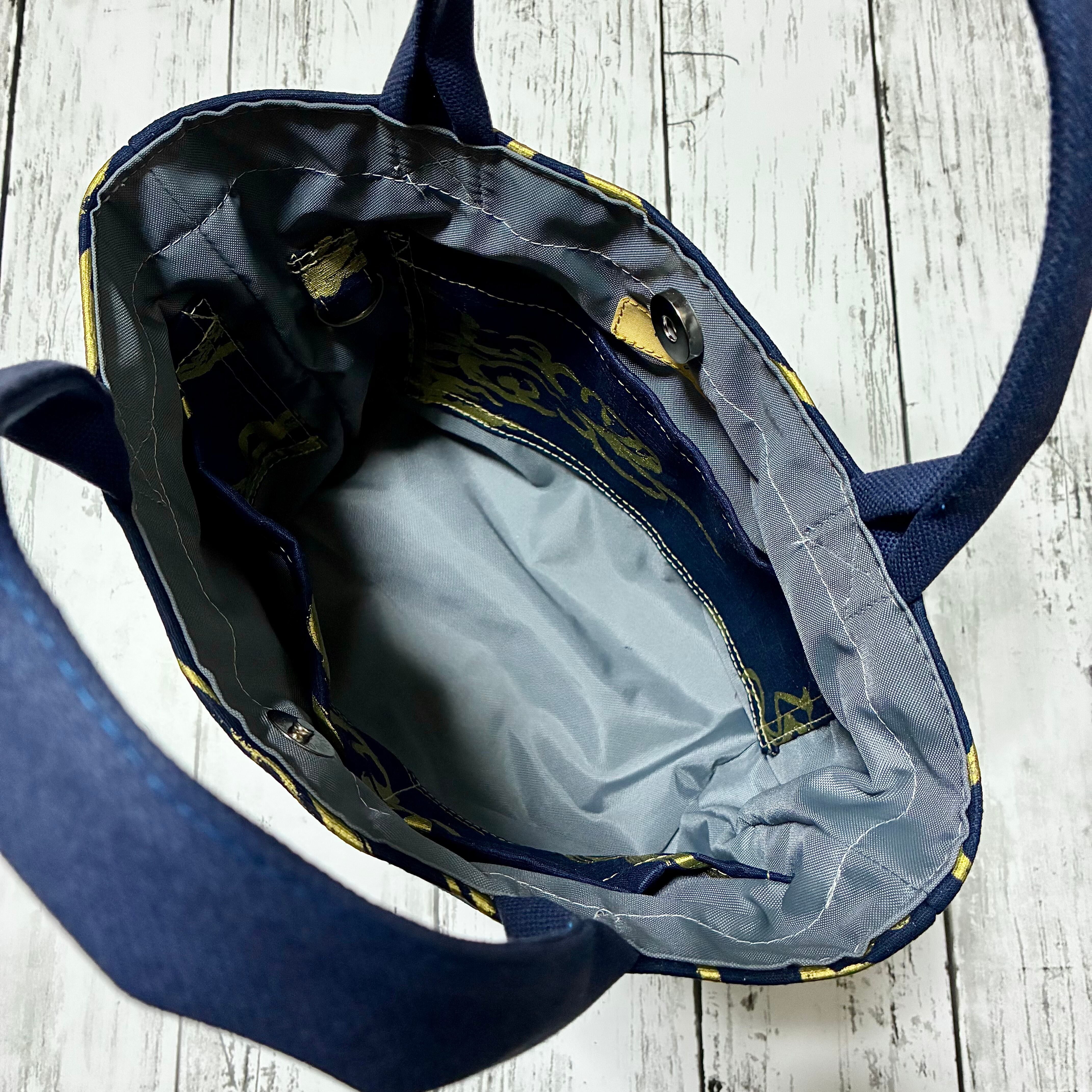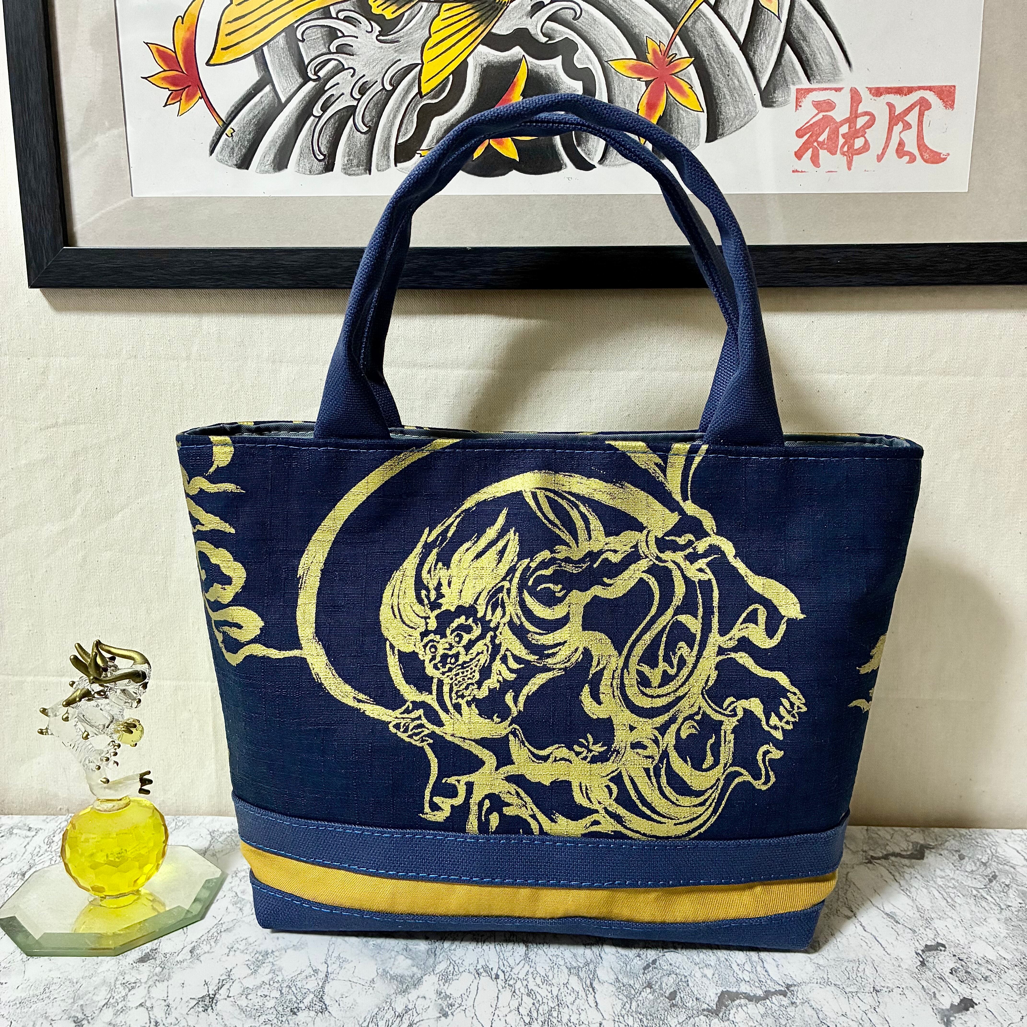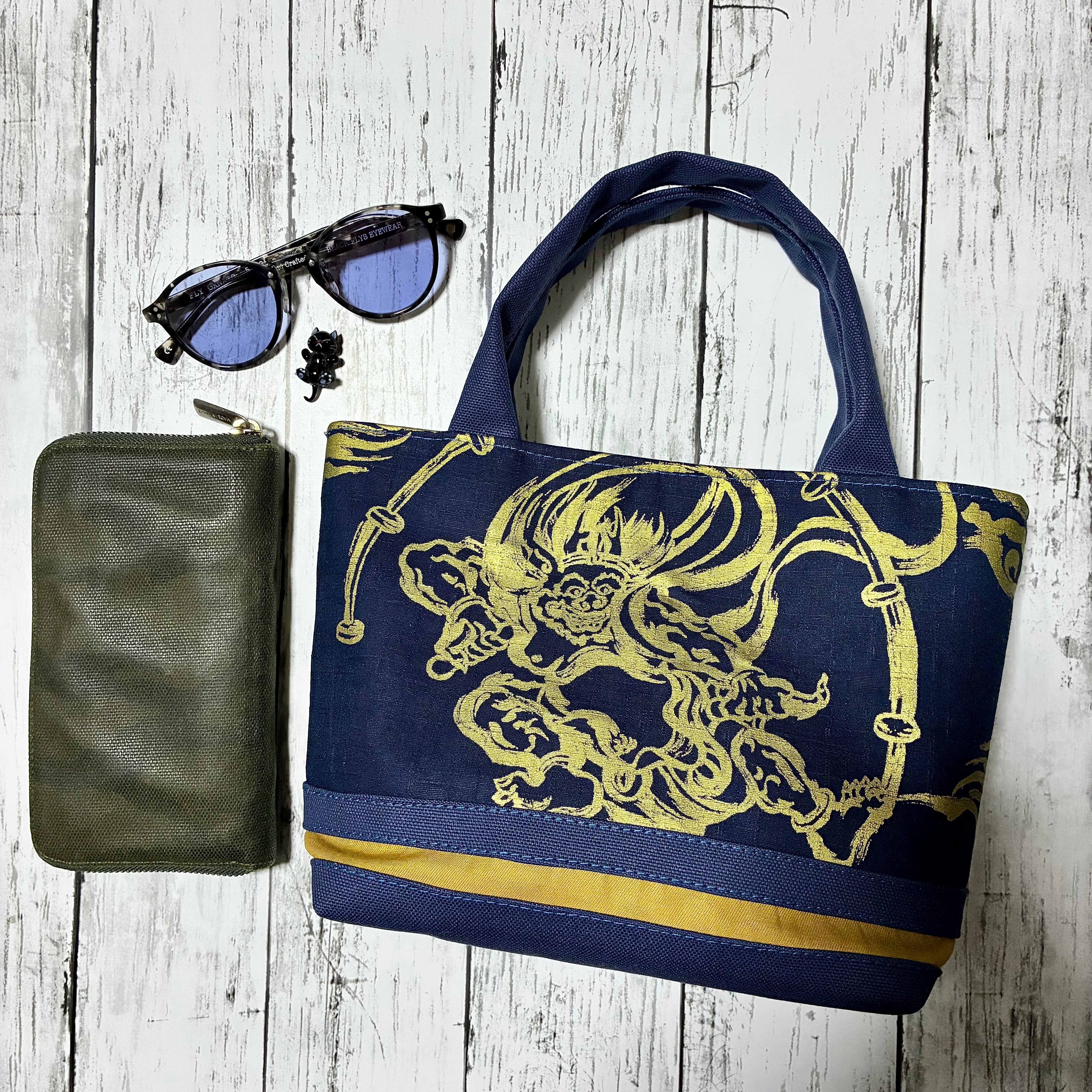 和柄ミニトートバッグ 風神雷神 ネイビー Dカン付き ハンドメイド ストリート 帆布バッグ